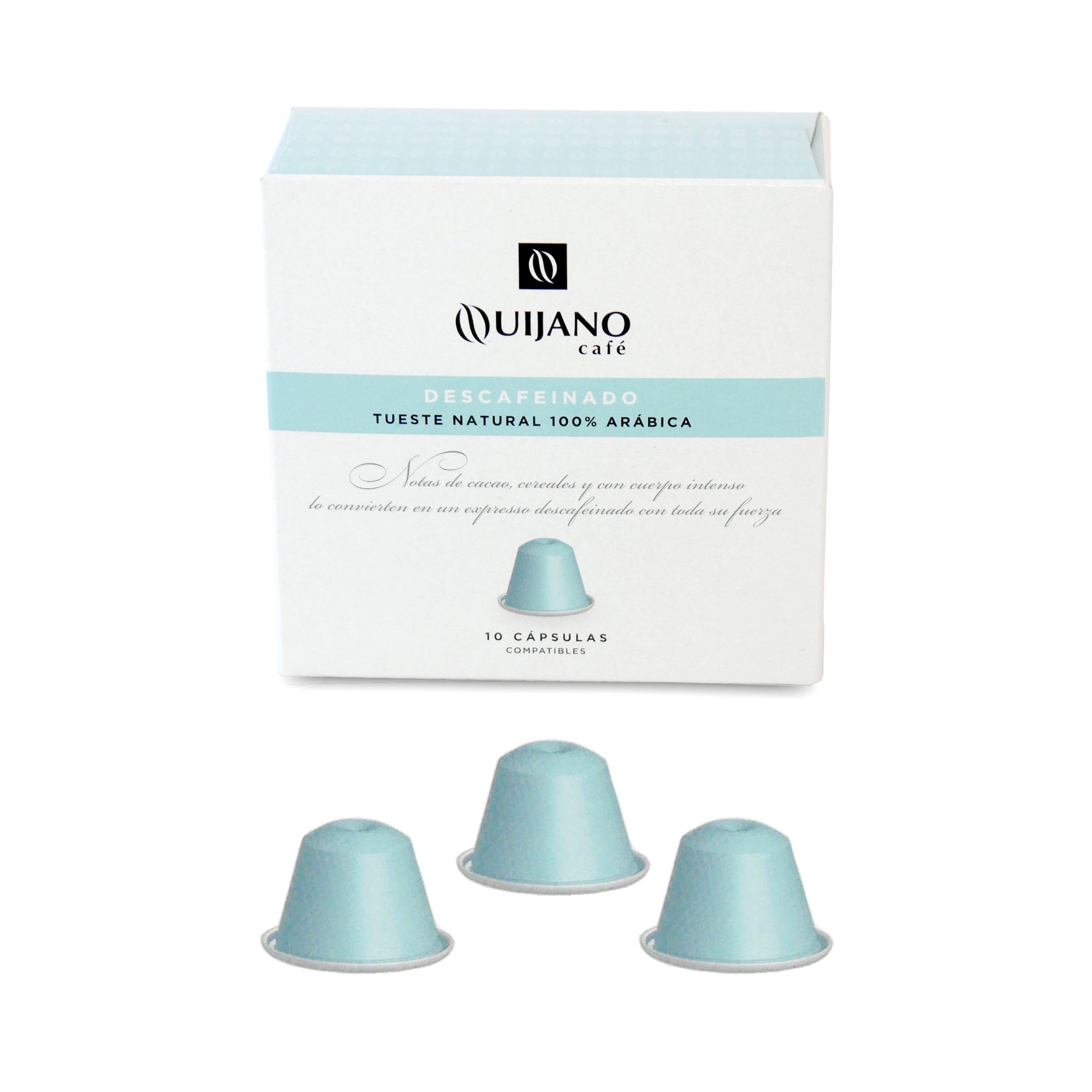 Estuche con 10 cápsulas ARÁBICA Quijano. Ahora con cápsulas 100% compostables.